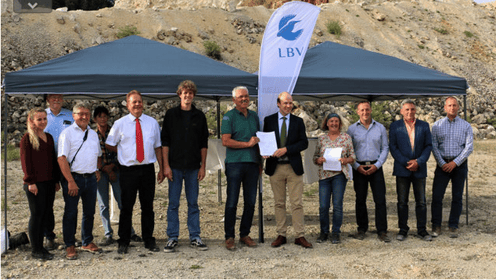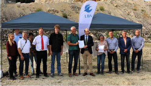 Der LBV hat in Schwaben einen weiteren Kooperationsvertrag mit einem Rohstoffgewinnungsunternehmen zum Schutz von bedrohten Amphibien abgeschlossen. Bei einem Geländetermin im Steinbruch in Harburg haben der LBV-Landesfachbeauftragte Dr. Andreas von Lindeiner, Maximilian Graf Pückler-Märker, Geschäftsführer Märker Zement GmbH, der stellvertretende Landrat Reinhold Bittner, der Bürgermeister von Harburg Wolfgang Kilian, Michael Strauch (BIV) sowie der Vorsitzende des Bayerischen Naturschutzfonds Georg Schlapp sich das Umsetzungsgebiet angesehen. Mit dem Vertrag nimmt das Werk nun an einem bayernweiten Projekt zum Schutz von bedrohten Amphibienarten in Rohstoffgewinnungsstätten teil. „Durch das Pilotprojekt soll die Förderung und Erhaltung bedrohter Amphibienarten im Gewinnungsprozess gesichert und der laufende Betrieb auch bei schon existierendem Vorkommen bedrohter Arten in einer Win-Win-Situationgewährleistet werden“, so der LBV-Landesfachbeauftragte Dr. Andreas von Lindeiner.