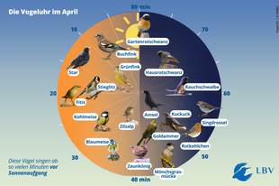 Vögel brauchen morgens keinen Wecker. Ihre innere Uhr orientiert sich hauptsächlich am Zeitpunkt des Sonnenaufgangs und der Helligkeit ihrer Umgebung. „Zusätzlich haben auch die Temperatur und die Stimmen anderer Vögel Einfluss auf den Zeitpunkt des Aufwachens“, so der LBV-Vogelexperte. Da sich diese Wecksignale jedoch artspezifisch unterscheiden, beginnen die Vögel zu unterschiedlichen Zeitpunkten mit ihrem morgendlichen Gesang.
